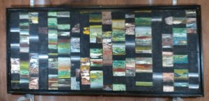 having drawn and painted figuratively in many different styles, took himself off to an isolated French farmhouse for a month to see if a particular style would emerge. After studying forms of nature – bark, lichen, seedpods; he used collage and paint to develop an abstract rendition. Later, he incorporated cityscapes- neon light, graffiti, exploring where nature and urban life intersected. Over time his paintings have become wider, often involving vertical strips, combining scraped raw colour and intricate patterning. He often works on strips of wood painted and repainted which are placed together to find an interesting dynamic.