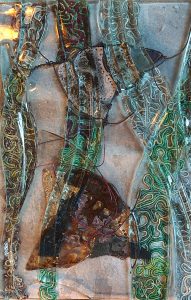 interest in the natural forms within nature led to drawing, painting and sewing which resulted in her three dimensional textile creations. She likes to incorporate found objects within her work, rusty metal, shells, stones and glass. In preparation of each piece of work she does extensive research, often looking at the traditional art from other cultures, filling many pages with drawings, paper treatments and stitch techniques. Her work explores the opposing nature of order and chaos, the combination of eruption, fission and expulsion. Her art reflects the need to bring discordant parts into a cohesive whole.